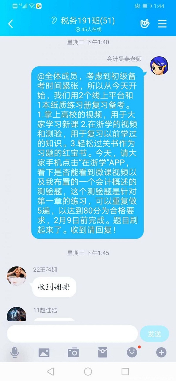 教授不停指导不断,悉心教学。针对四、五月份要进行的初级会计师考试和省会计技能竞赛,为了不让疫情影响学生的备考备赛,在浙江省优秀共产党员、支部书记吴燕的号召下,支部党员教师在假期义务对有竞赛和考证需求的学生进行线上辅导、答疑,每天用6个小时的时间批改竞赛作业和知识点梳理。在支部党员的带动下,非党员教师也参与到考证指导工作中来,满足了8个班近400名学生的考证指导需求。为了贯彻“停课不停学”的要求,打好线上教学攻坚战,确保线上教学质量,支部党员教师深挖线上教学资源、研讨线上教学方案,15门专业课程全部采用线上教学方式,引导学生真正适应“移动学习”,掌握终身学习的方法。支部党员解媚霞在隔离期间,仍坚持在线指导学生竞赛,要求学生每日打卡汇报速度和准确率,完成习题且正确率需达到100%,完成点钞6000多张。